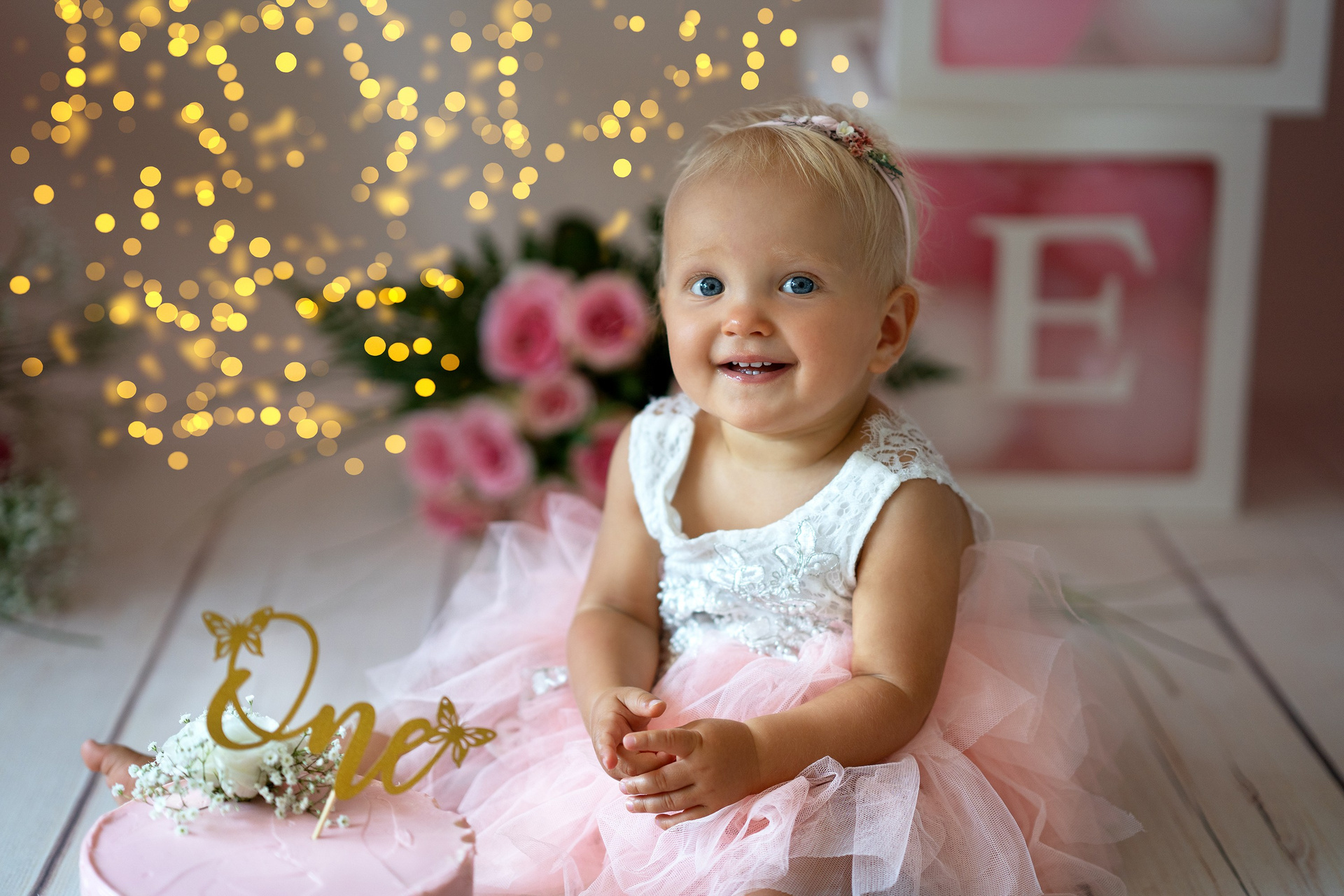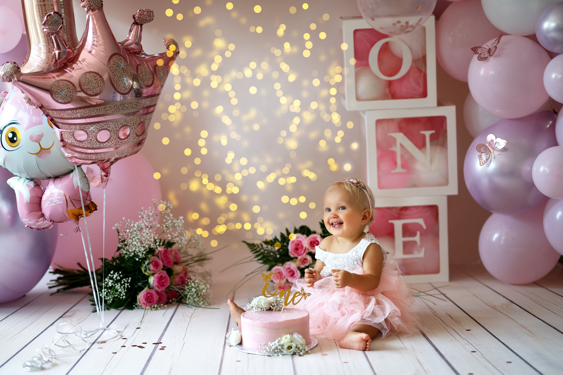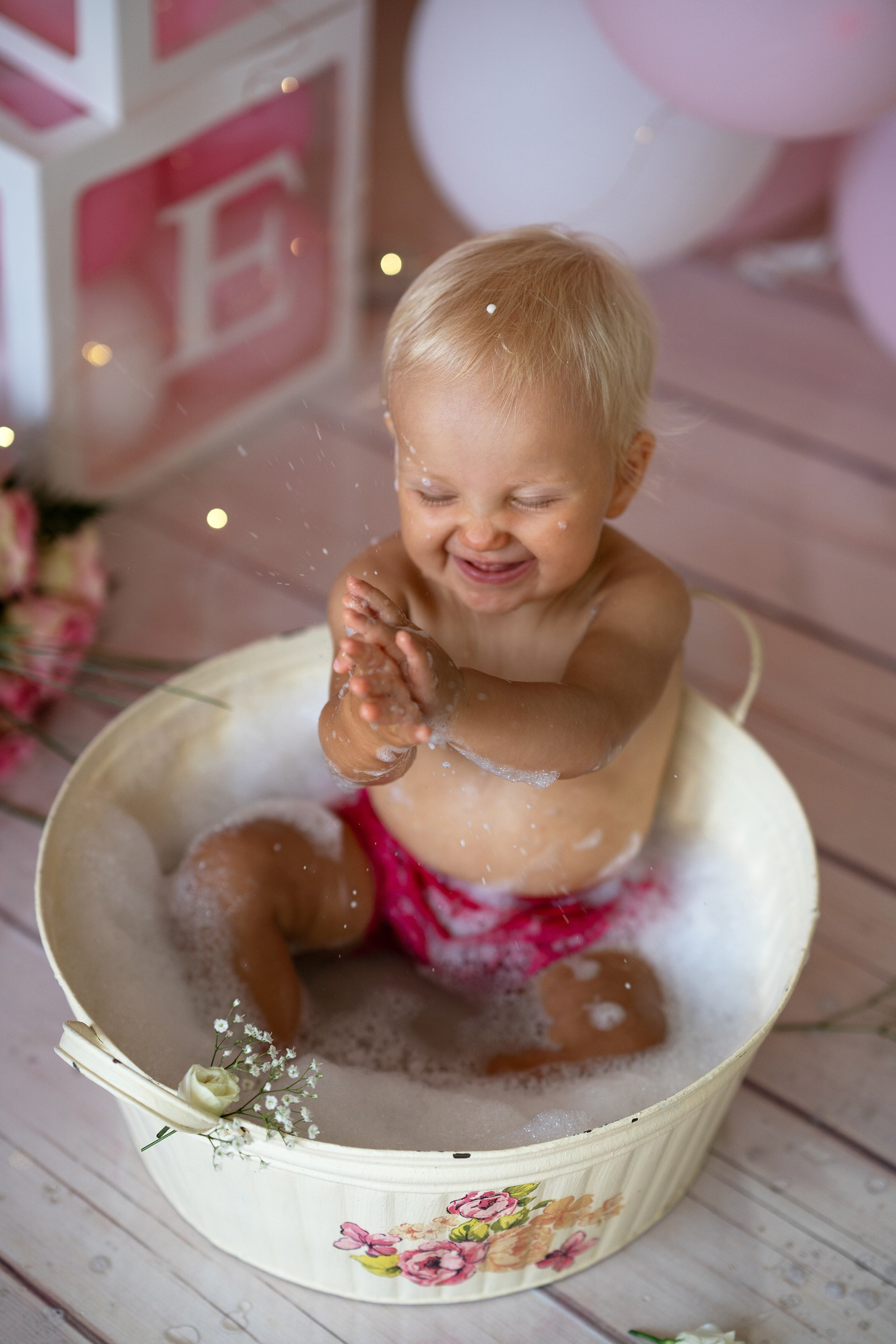 Der erste Geburtstag Ihres Kindes. Fotosession mit Torten, Blumen und Bad